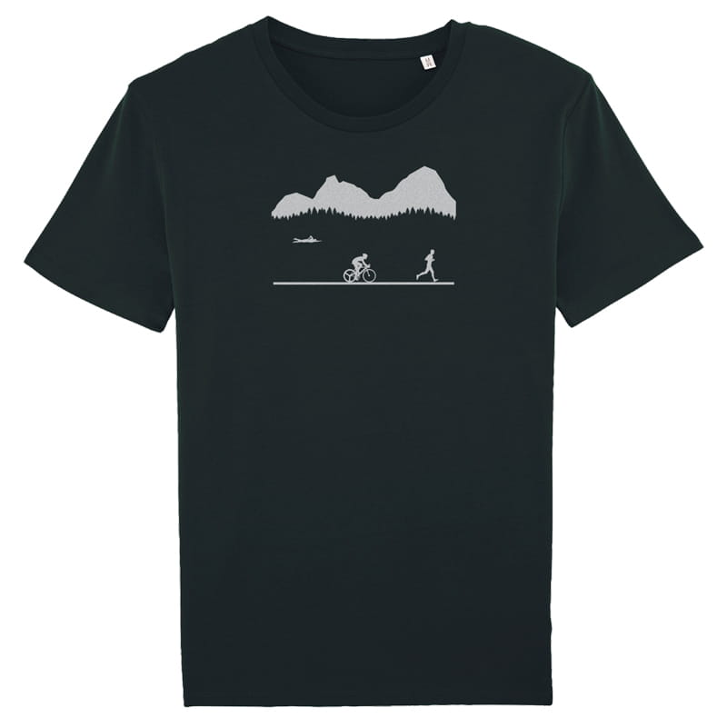Das schlichte Design zeigt ein dynamisches Triathlon-Motiv: Berge, dichte Wälder und die Silhouetten eines Schwimmers, Radfahrers und Läufers.